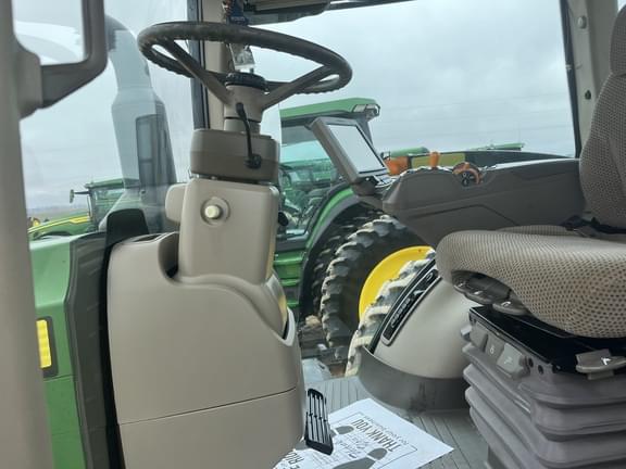 Cab: Cab, Transmission: Power Shift, Rear PTO: 1000, Rear Tires: Duals, Tire Width: Mid, 16F/5R Speed PowerShift Transmission (PST) 42 km/h (26 mph), 4600 CommandCenter, 4600 Processor, Premium CommandView III Cab with ActiveSeat, Premium Radio Package with XM Radio, Right-hand Reverser Bump-Shift-Type Transmission Controls, John Deere PowerTech 9.0 L (549 cu. in.) 6 Cylinder Tier 4/Stage V Compliant Diesel Engine, 227.1 L/min (60 gpm) Hydraulic Pump, Five Premium Rear Remote SCVs with Electrohydraulic (EH) Controls, Premium Couplers, and High Pressure Relief Levers, 45 mm (1-3/4 in.) 1,000 rpm (20-spline) PTO, 9,072 kg (20,000 lb) capacity 3-Point Hitch (Cat 4N/3) Hitch with Sway Blocks and Quik-Coupler, Category 4 adjustable Swinging Drawbar with 50 mm (2 in.) Pin, 120 mm (4.72 in.) diameter by 3010 mm (118.5 in.) length with Double Taper Wheel Hubs, 480/80R50 159A8 R1W Radial in Dual Wheel Configuration, Firestone Brand Only, ILS with hydraulic differential lock, fully-enclosed driveline and Group 48 Rear Tires, 420/85R34 147A8 R1W Radial in Single Wheel Configuration - Eight Position, Premium Lighting, Fenders, Pivoting Front - 480 mm (18.9 in.) Wide, Ethernet Switch, Antenna Mount and Wiring for Business Band (2-Way) Radio, Cold Weather Start Kit, Auxiliary Hydraulic Connections - 1/2 in., Weight, front support with twenty-two suitcase weights, One Pair 625 kg (1378 lb)