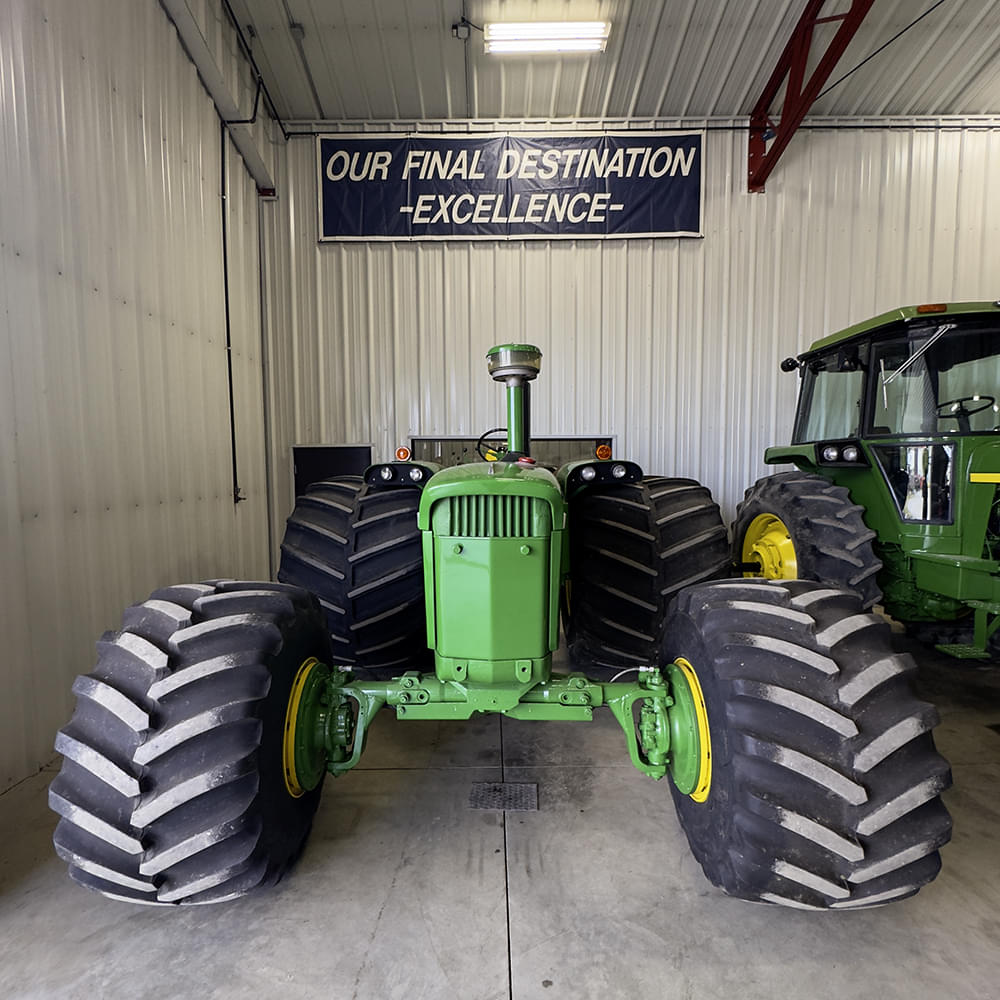 The base tractor started life as a 1971 4020 HFWD Wheatland — side console, synchro, no 3-point, just a couple of remotes, PTO, and a wide-swing drawbar. Jon knew he had it but didn’t really have a plan for it…until he spotted a set of old combine tires in the shop one day. That’s when the light bulb came on.
